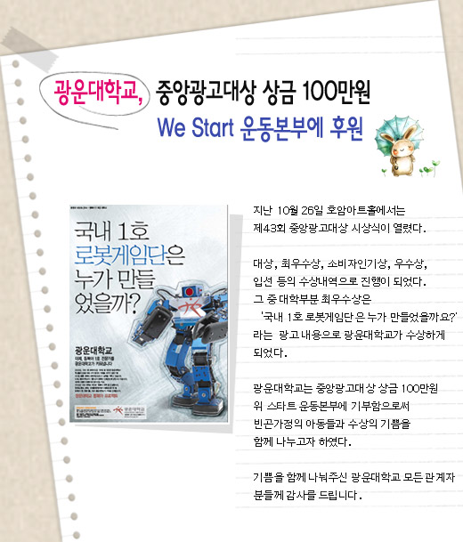 '가장 아름다운 꽃을 가꾸는 사람들의 이야기'는 We Start 운동본부에 후원해 주시고 계시는 후원자분들의 이야기를 나누는 공간입니다. We Start 아동을 위한 후원에 참여해 주시는 분들은 어떤 꽃밭을 가꾸는 분들일까요? 담배 한 갑이면 2,000원, 한달이면 6만원... 김석환(52세)씨는 의미없게 쓰여지는 이 돈을 값지게 쓸 수 없을까 고민한다. 2005년 중앙일보에 우리나라 빈곤아동의 사연이 실렸다. 김석환 씨는 여전히 우리나라에 빈곤아동이 있다는 것을 보고 차라리...