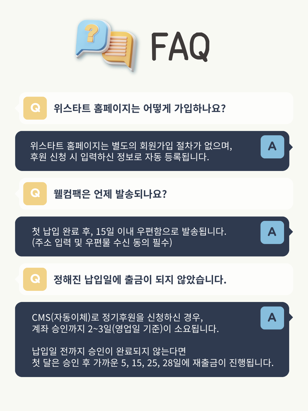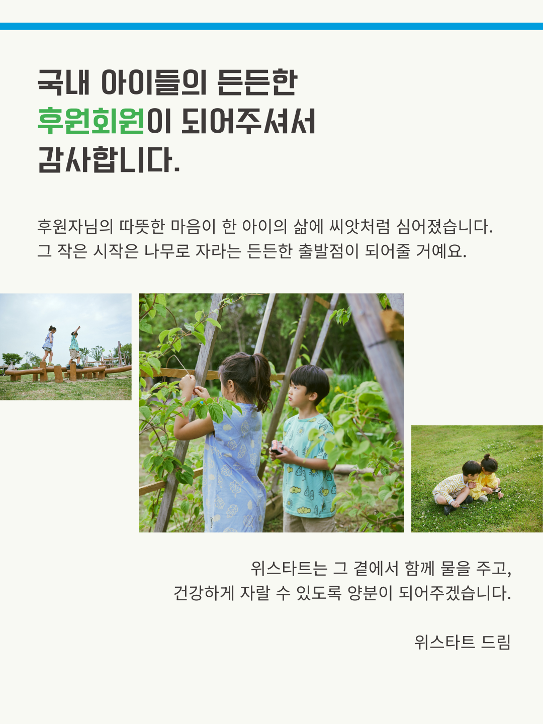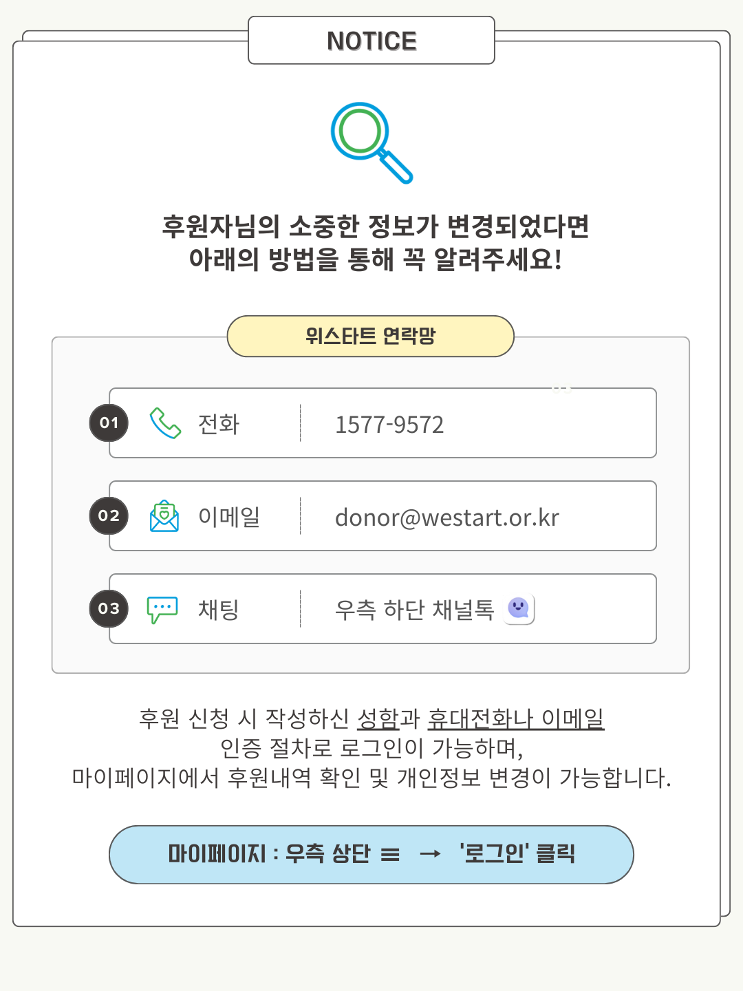 사단법인 위스타트 서울특별시 마포구 상암산로 48-6, 10층 대표전화 : 02-318-5004 후원문의 : 1577-9572 이메일 : we@westart.or.kr