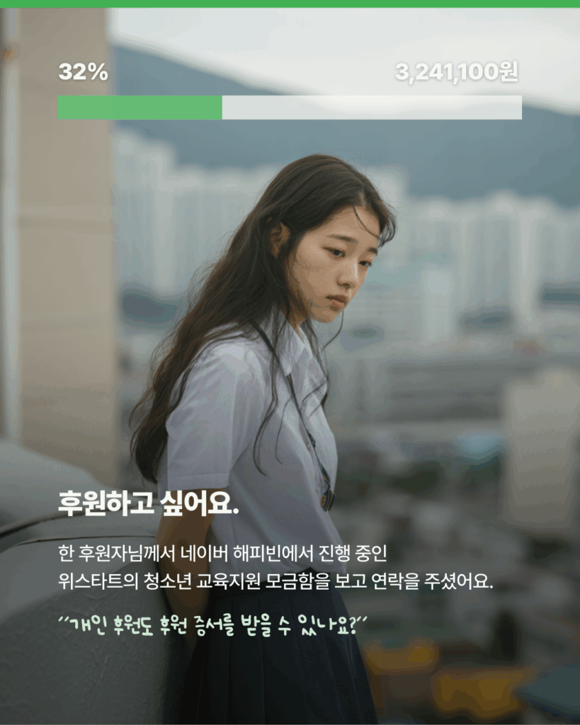 네이버 해피빈에서 진행 중이던 청소년 교육지원 모금함을 보고 “개인 후원도 가능할까요? 후원 증서도 받을 수 있나요?”라는 문의를 해주셨어요.