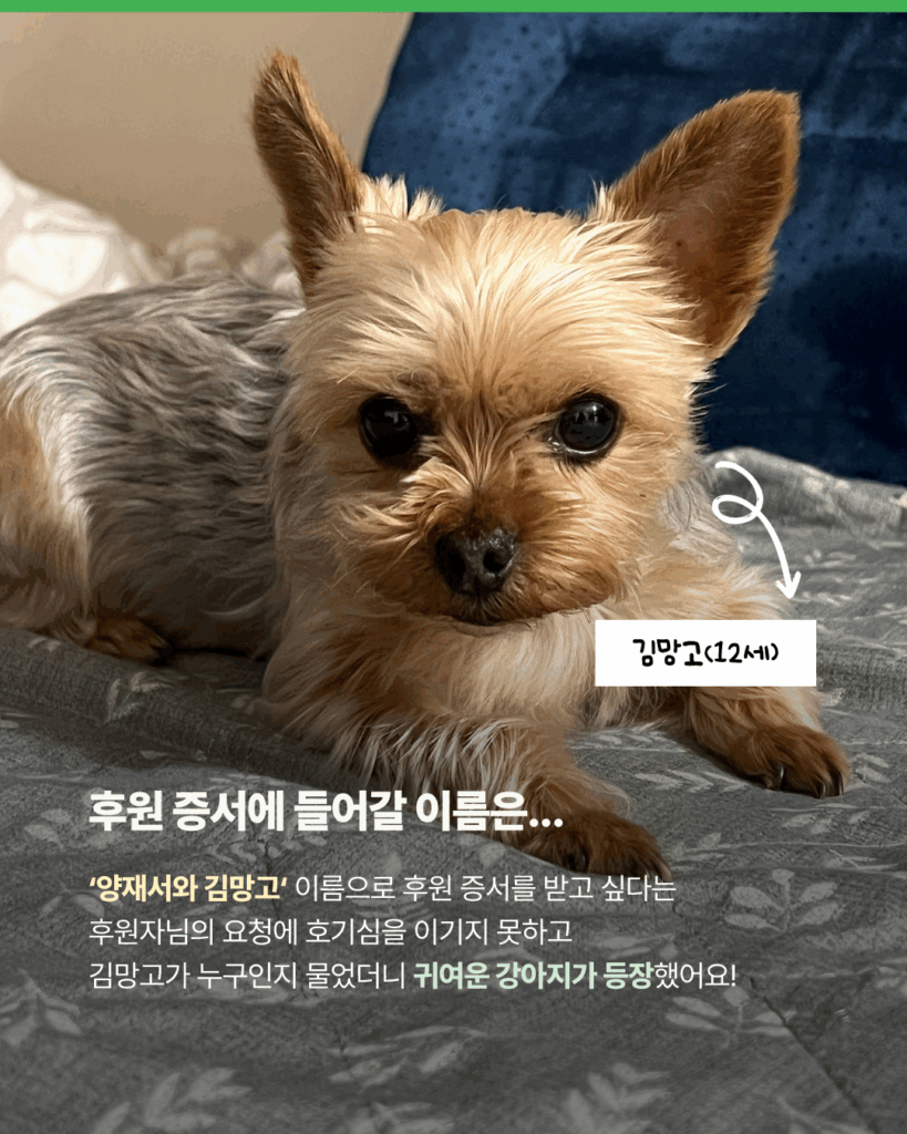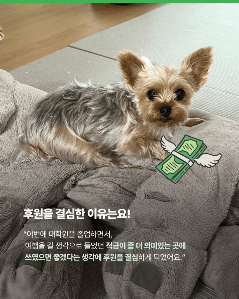 원래는 여행을 계획했지만, “적금을 조금 더 의미 있는 곳에 쓰면 좋겠다”는 생각으로 후원을 결심하셨다고 해요! 그리고 그 동행자로 자신과 언제나 함께해온 강아지 김망고를 선택하신 겁니다😍