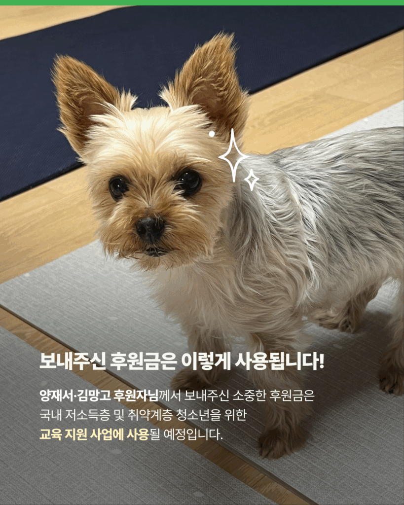 양재서와 김망고 후원자님이 보내주신 후원금은 국내 저소득층 및 취약계층 청소년들의 교육 지원에 사용됩니다.