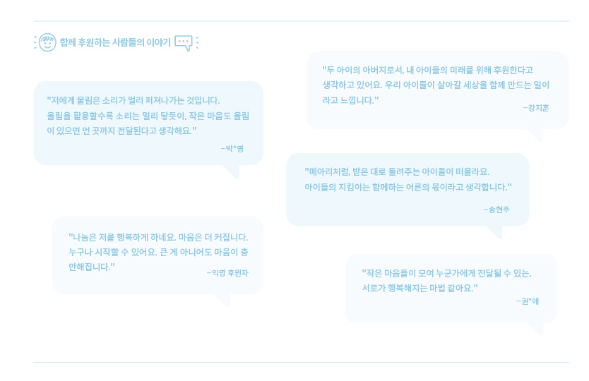 “매달 자동이체로 지나가는 작은 금액일지 몰라도, 누군가에게는 그 달을 견디게 하는 숨이 되고, 다시 꿈을 꾸게 하는 씨앗이 될 수 있겠다는 생각을 하게 됩니다. 한 번의 선의가 아닌 반복되는 사랑이라는 점이 참 감사하고 아름답다고 생각합니다.”